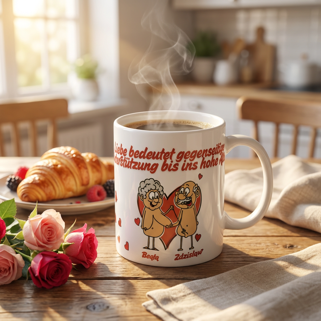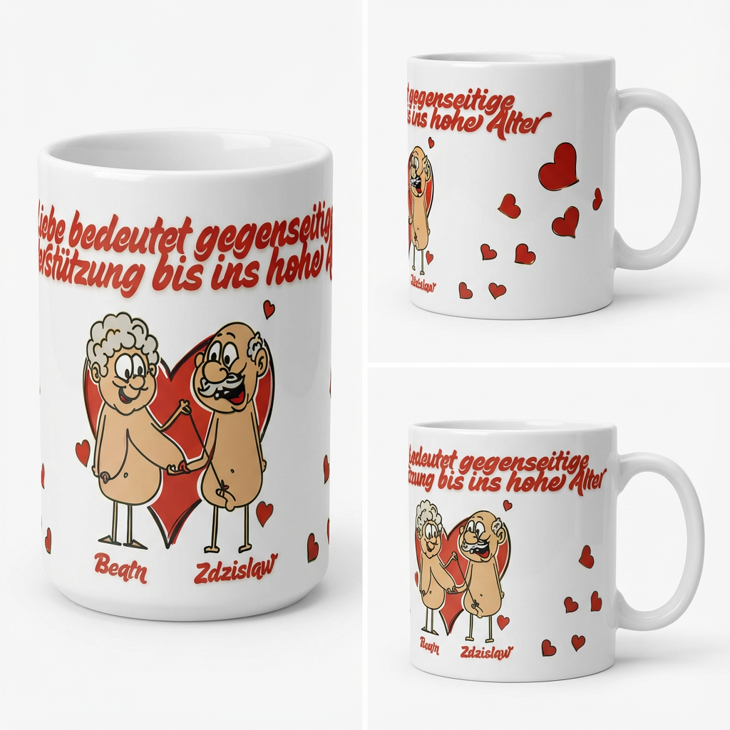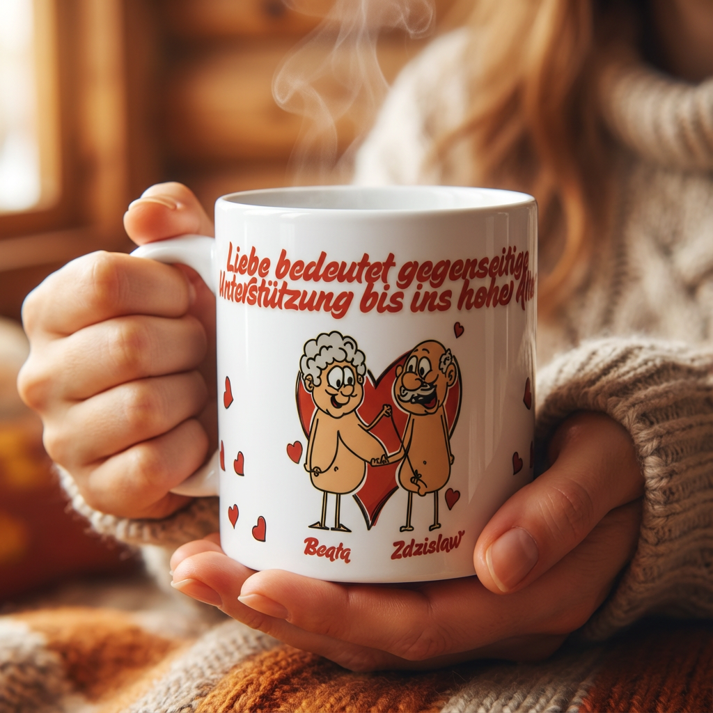 Zeigen Sie Ihre Liebe mit diesem einzigartigen personalisierten Keramikbecher! Der humorvolle Spruch „Liebe bedeutet gegenseitige Unterstützung bis ins hohe Alter“ zusammen mit dem niedlichen Oma-Opa-Design macht diesen Becher zum perfekten Geschenk für Paare jeden Alters.