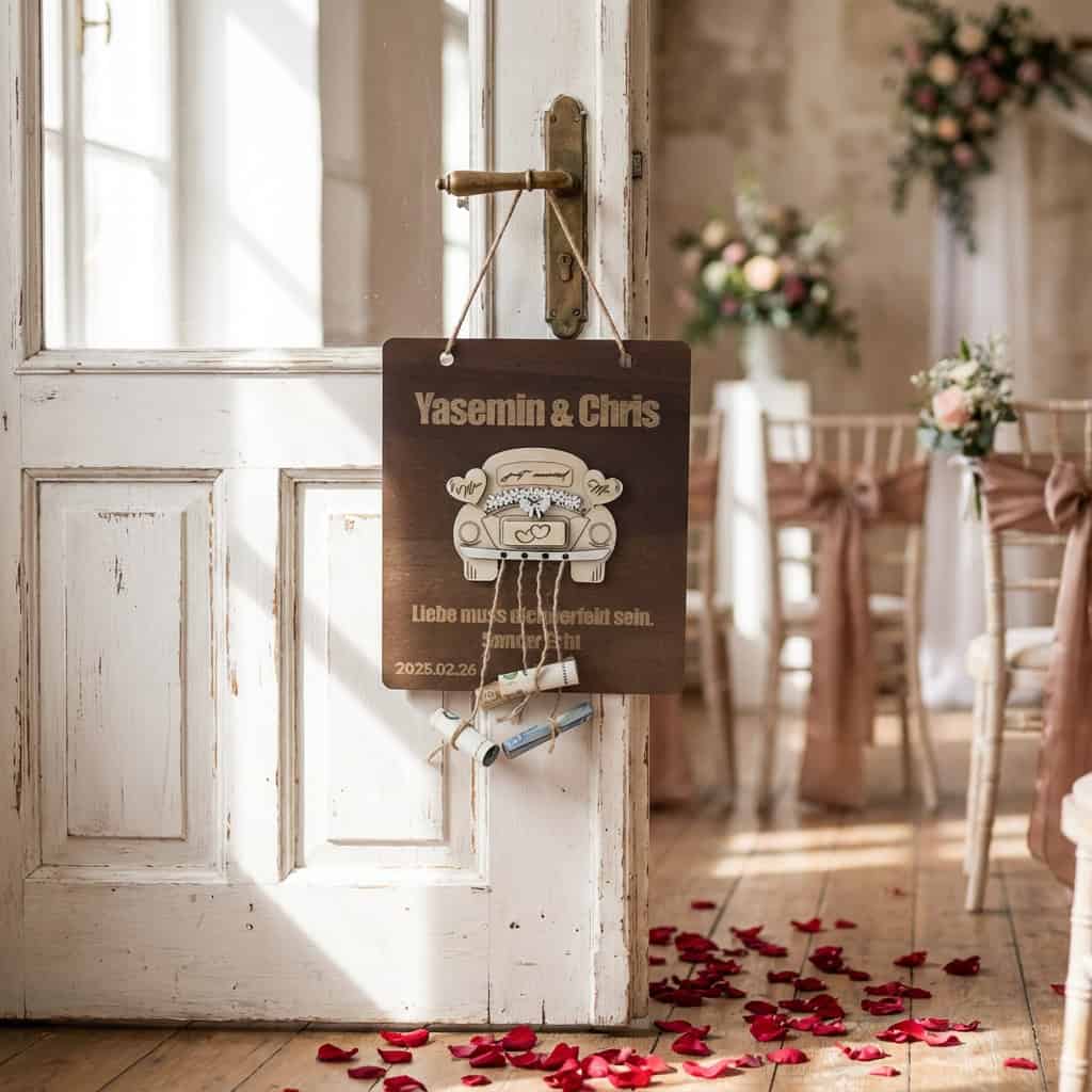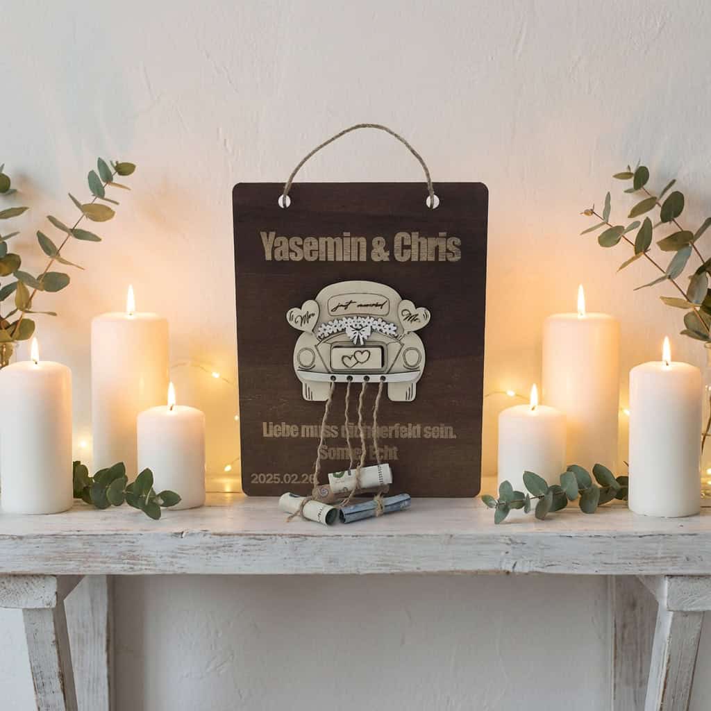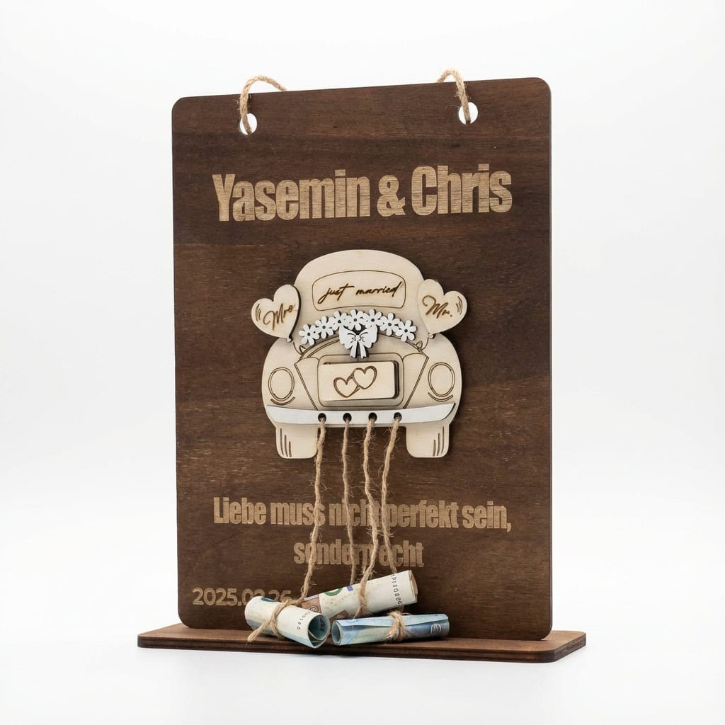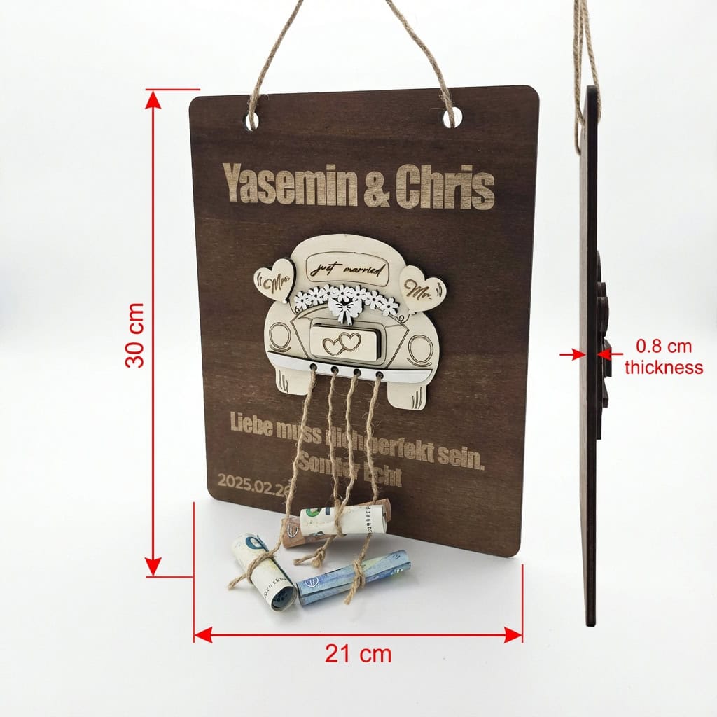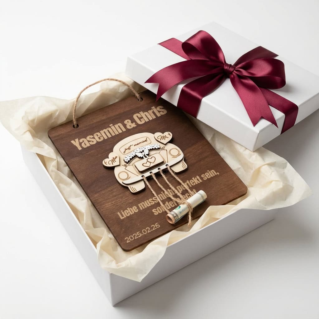 Du suchst nach einem außergewöhnlichen Geschenk zur Hochzeit? Diese hochwertige Holztafel im Format A4 (ca. 21 × 29,7 cm) ist die perfekte Kombination aus Dekoration, Erinnerung und Geldgeschenk.