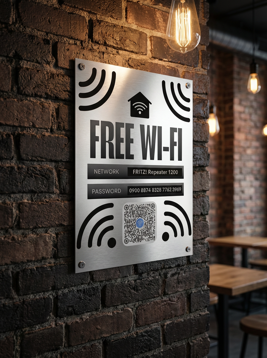 Schluss mit ewigen Nachfragen nach dem WLAN-Passwort. Unser personalisiertes WLAN-Schild aus gebürstetem Aluminium bringt Ordnung, Stil und Professionalität in jeden Raum – ob Restaurant, Hotel, Café, Airbnb, Büro oder Zuhause.
