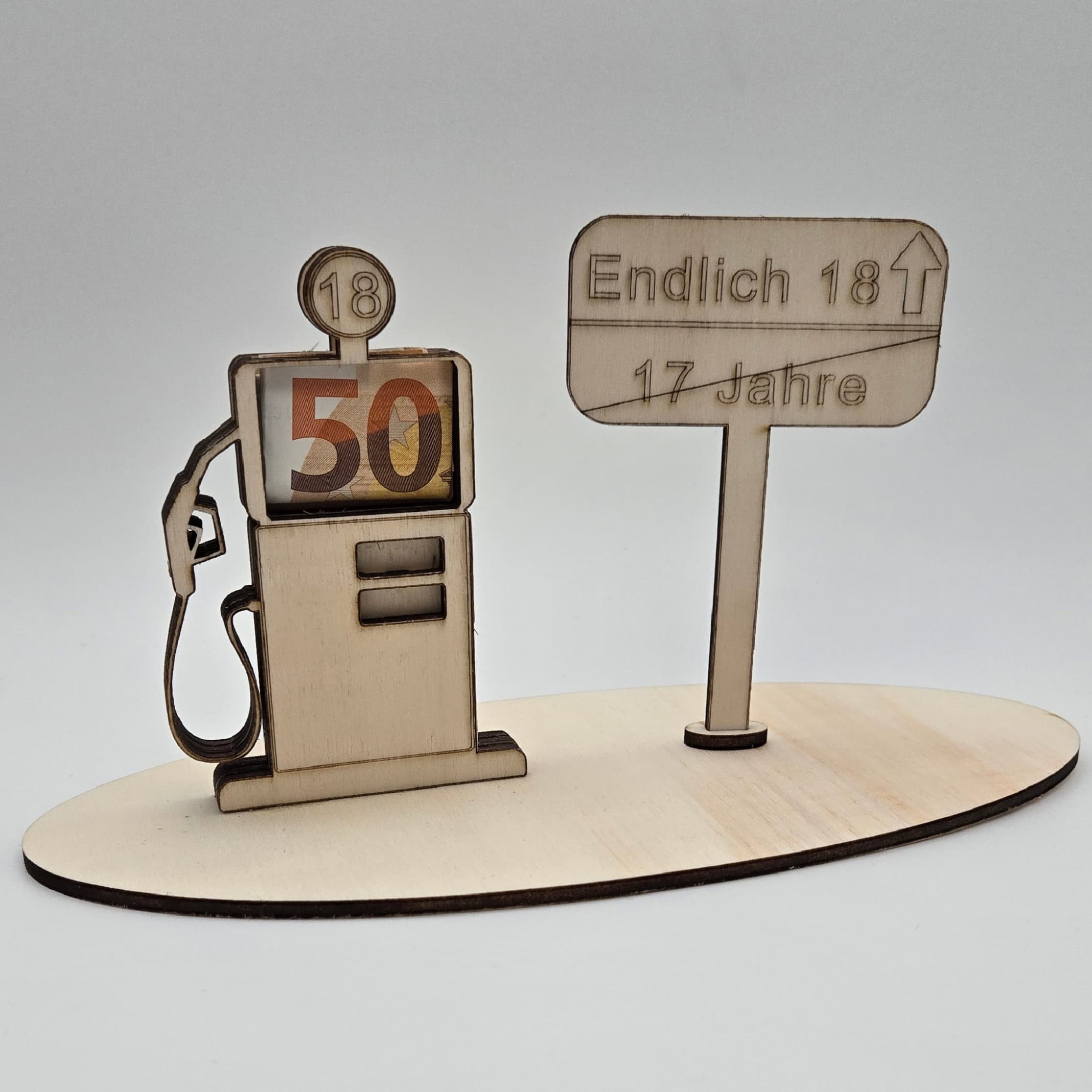 Das Set besteht aus einer Miniatur-Tankstelle mit sichtbarem Geldschein (z. B. 50 Euro) und einem Wegweiser mit der Aufschrift „Endlich 18↑“, wobei das frühere „17 Jahre“ durchgestrichen ist.