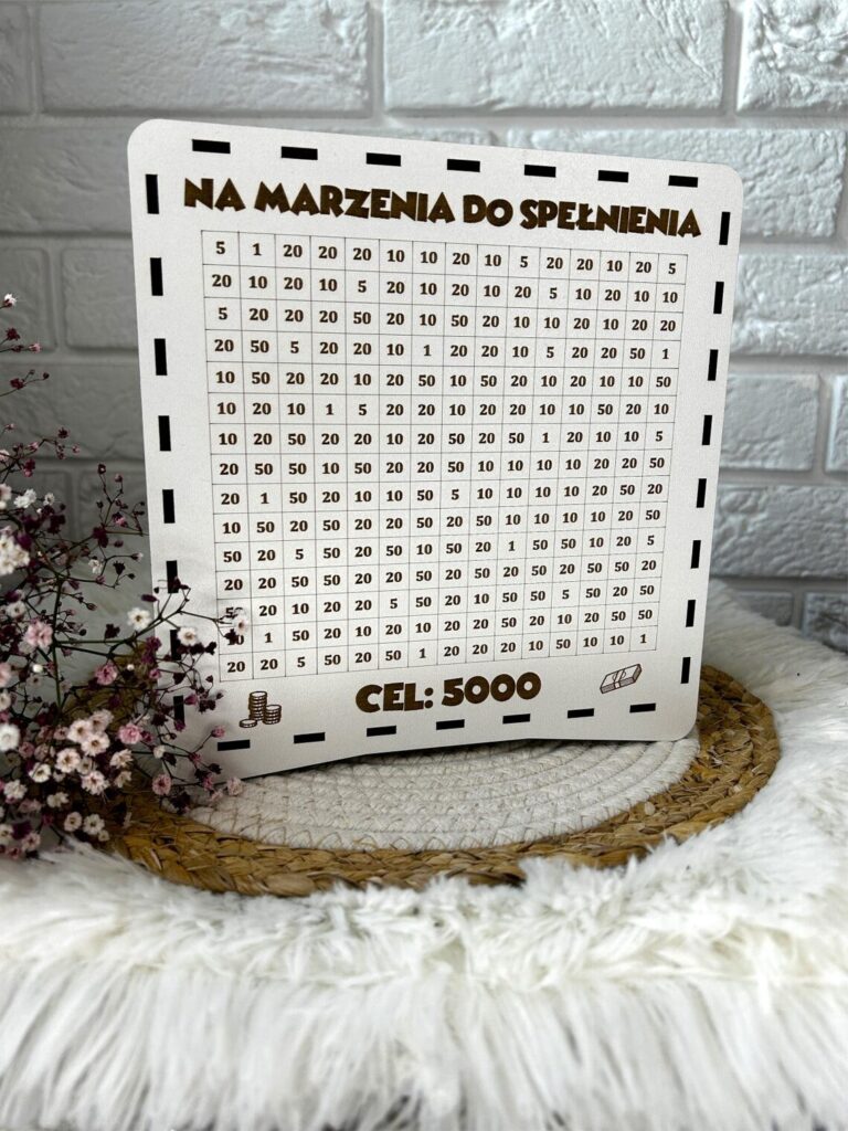 Stylowa i funkcjonalna skarbonka „Na marzenia do spełnienia” to idealny sposób na motywację do odkładania pieniędzy – wystarczy zakreślać kwoty, by śledzić postępy w realizacji celu 5000 zł. Wykonana z wysokiej jakości materiałów, świetnie sprawdzi się jako oryginalny prezent lub inspiracja do spełniania marzeń!